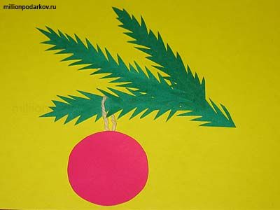 Из зеленой бумагу вырезаем одну длинную полосочку и две аленькие, вырезаем иголки. Перед тем как наклеить одну из маленьких веточек, одеть веревочку для шара.