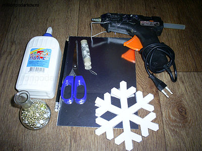 Итак, для того, чтобы сделать снежинку, нам понадобятся такие материалы как серебряный картон, клей ПВА, бусинки, ножницы, нитки, бумага, карандаш, клеевой термопистолет.
