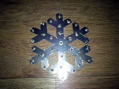 Для начала распечатайте на принтере или нарисуйте на листе бумаги шаблон снежинки. Вырежьте ее и наклейте на обратную сторону блестящего картона.