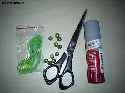 Для изготовления елочки приготовьте готовые бумажные полоски для квиллинга, которые, впрочем, можно нарезать самостоятельно из цветной бумаги, ножницы, клей, бусинки и кусочек пластика, к которому мы и приклеим нашу поделку.