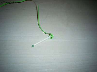 С помощью ножниц расщепим верхнюю часть спички. Прикрепим к ней кончик бумажной полоски и начнем закручивать ее вокруг оси. Скрутку делайте не плотную, ведь наше изделие должно получиться пышным и «воздушным». Приклеим конец полоски к заготовке.