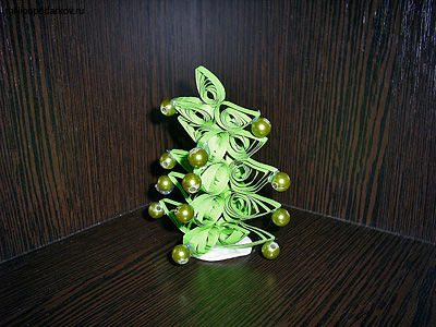 Берем наши заготовки и пальцами сжимаем их с одного края. Из получившихся деталей и складываем нашу елочку. Для этого сначала сделаем плоскую поделку, склеивая по две детали одного размера, постепенно уменьшая их к верхушке. Затем приклеиваем подобные детали с одной стороны под углом в 90 градусов, а затем с другой стороны. Вот что у нас должно получиться в итоге.