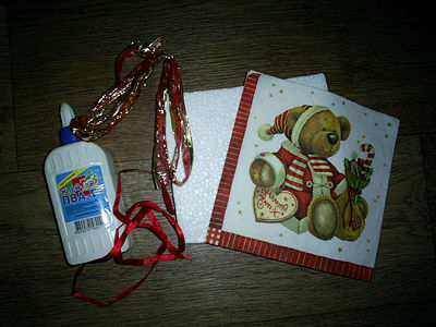 Для того чтобы сделать новогоднее украшение из пенопласта, подготовьте такие материалы, как пенопласт, салфетку с новогодним рисунком, клей ПВА, атласную ленточку, канцелярский нож, ножницы, ленту декоративную, мишуру и клеящий термопистолет.