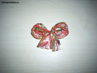 Из декоративной ленточки на проволочной основе сделайте вот такой бантик. Перевяжите его кусочком проволоки.