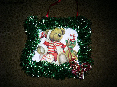 По краю картинки приклеиваем мишуру. Для этого используем клеящий термопистолет. Крепим бантик и атласную ленточку, чтобы изделие можно было повесить. Сзади изделия можно написать текст поздравления. Такая поделка станет замечательным украшением для входных дверей. Теперь Ваши гости будут точно знать, что у Вас в доме поселился Новый год.