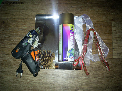 Для того чтобы сделать игрушку на елку, мы использовали такие материалы, как клеящий термопистолет, золотую краску аэрозоль, металлизированную цветную бумагу, декоративные ленточки, сосновую шишку, ножницы.
