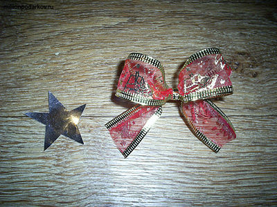 Из золотистой бумаги вырезаем звездочку. Из ленточки делаем бантик.