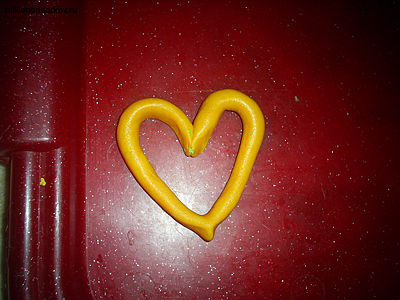 Желтое соленое тесто раскатываем в колбаску и соединяем ее в форму сердца.
