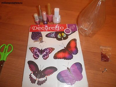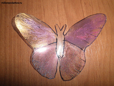Вырезанную из пластиковой бутылки бабочку покываем разноцветным лаком, делая акцент на перламутровые тона и ждем, когда высохнет.