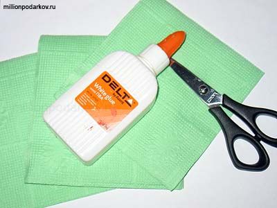 Для работы мы приготовим лист белой бумаги, зеленые салфетки, ножницы и клей ПВА.