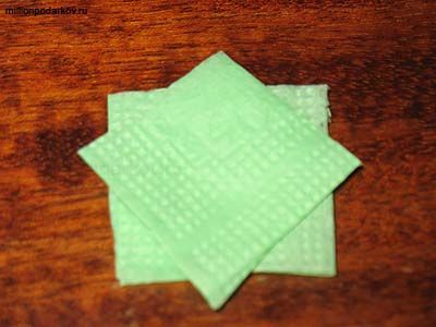 Салфетку разрезать на 4 части, две части положить как показано на фото и склеить посередине клеем. Достаточно одной капли на все слои, хорошо прижать место склейки. Или, если есть степлер, то можно скреплять салфетки с его помощью.