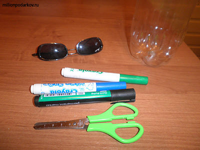 Для того, чтобы сделать очки 3D нам понадобится прозрачная пластиковая бутылка, маркеры красного, синего и зелёного цветов. Приготовим ножницы и старые солнечные очки.
