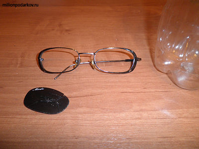 Аккуратно вынимаем из солнечных очков стекла и обрисовываем их на разрезанной пластиковой бутылке.