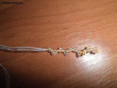 Сначала набираем цепочку для больших лепестков, нанизывая 21 бусинку, потом продевая через одну делаем ее в виде крестиков.