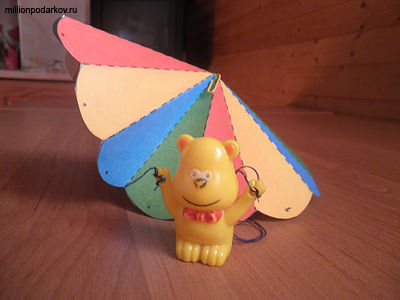 К игрушке привязываем нити таким образом, чтобы он «летел» ровно. Постараемся сделать симметрично. Для этого с помощью иголки прокалываем парашют в нескольких местах.