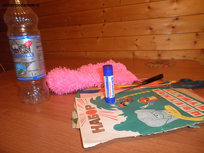 Для изготовления объемной поделки из пластиковых бутылок нам понадобится 1,5 литровая бутылка, набор цветной бумаги, клей, мочалка и шило. Подготовьте несколько зубочисток и трубочек от сока.