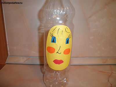 На желтый овал приклеиваем оранжевые щечки, синие глазки и черным маркером рисуем реснички. Мы получили веселую рожицу клоуна, которую и приклеим на пластиковую бутылку.