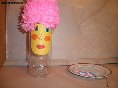 На голову клоуну надеваем яркую мочалку, которая будет играть роль парика. Объемные поделки из пластиковых бутылок для детей делают жизнь интереснее.