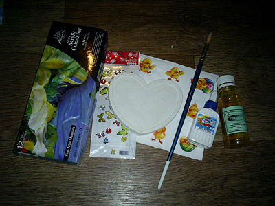 Для декорирования гипсового слепка нам понадобится салфетка с веселыми цыплятами, акриловые краски, клей ПВА, кисточка, акриловый лак, наклейки.