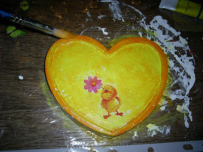 Вырезаем из салфетки цыпленка с цветочком, отделяем верхний красочный слой и приклеиваем на клей ПВА к сердцу. Получается вот такая аппликация. Теперь раскрашиваем сердце акриловыми красками в желтый и оранжевый цвета.