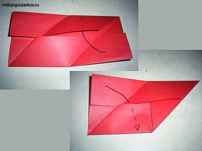 Намечаем две линии, как указано на фото. Нижний правый угол заворачиваем под верхний правый слой бумаги. Верхний левый угол закладываем в карман, который получился в итоге.