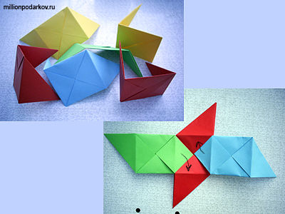 Сделаем еще пять разноцветных деталей. Начинаем складывать кубик, присоединяя складки одних деталей к карману других, как указано на нижнем фото. Таким образом, присоединяем две детали.