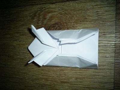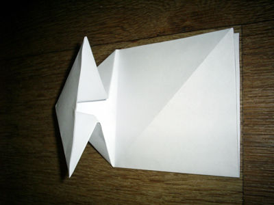 Получившийся прямоугольник складываем еще раз пополам и разворачиваем. Делаем два диагональных сгиба на верхнем квадратике. Складываем два противоположных треугольника друг к другу и накрываем его верхним треугольником. Должно получиться так, как на фотографии.