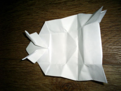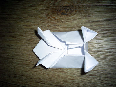 Теперь складываем нижний квадрат пополам. Два угла на верхнем квадрате подгибаем вверх. Получившиеся уголки еще загибаем немного вниз – формируем лапки лягушки.