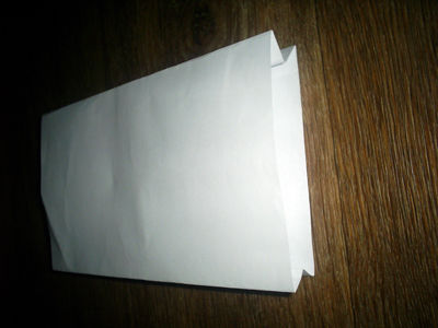 Делаем из листа бумаги пакетик. Складываем его поперек. С краю делаем широкую каемку, которую складываем три раза, чтобы получилось три одинаковые по ширине сгиба. Теперь к крайнему сгибу приклеиваем противоположный конец листка. Напротив двойного сгиба делаем идентичную деталь. У нас должен получиться вот такой пакетик. В данном случае все делается без схем, «на глаз».