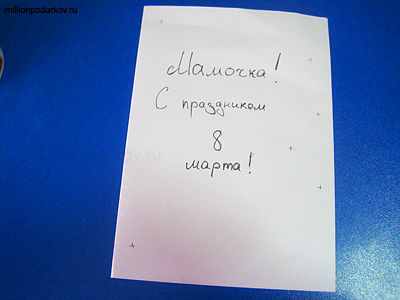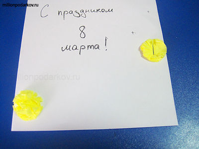 Лист бумаги согнуть пополам. Подпишите открытку. Наметьте места для крепления будущих одуванчиков.