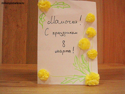 В предверии праздников детишки с большим удовольствием делают подарки. Поделки деток маме на 8 марта создают семейное единение, поскольку ребенок осознанно готовит сюрприз. Кроме основного подарка предлагаем подарить открытку, которая украшена весенними цветами одуванчиками. Создание такой открытки не займет много времени.