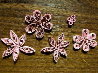 Далее нам необходимо придать форму нашим заготовкам. Берем заготовку и пальцами сжимаем ее до нужной формы (это можно делать сразу же после того, как приклеили свободный конец). Всего будет 4 цветка, они будут двух видов. Сделаем 12 ромбиков и 12 слезок – это будут лепестки. Чтобы сделать ромбик нужно сжать заготовку пальцами с двух сторон, а слезку – с одной стороны. Также нам надо сделать сердцевинки цветков, 4 штуки. Для этого сделаем тугую спираль – не снимая заготовки с зубочистки, приклеиваем свободный конец.
