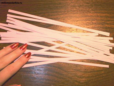 Берем лист цветной бумаги и разрезаем его на полоски шириной примерно 4 мм.