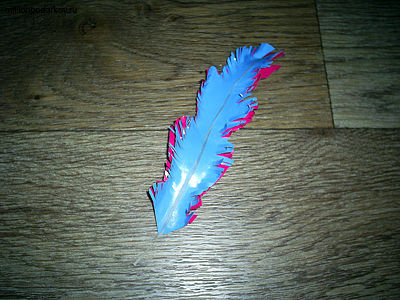 Теперь с его краев нарежьте бахрому. Склейте два перышка вместе, промазывая их посередине клеем. Сверху к поделке приклейте веточку. У нас получилось вот такое замечательное перо, которое можно использовать в различных дизайнерских работах и для украшения интерьера.