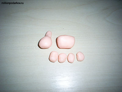 Из пластики телесного цвета делаем детали мамонта. Это лапки, туловище и голова с хоботом.
