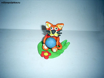 Теперь добавим детали, такие как глазки, мордочка, носик, ротик, усики, когти на лапках и посадим котика на лужайку с травкой и цветочком. Дадим ему в лапки мячик. Вот такая забавная пластилин поделка получилась у нас.