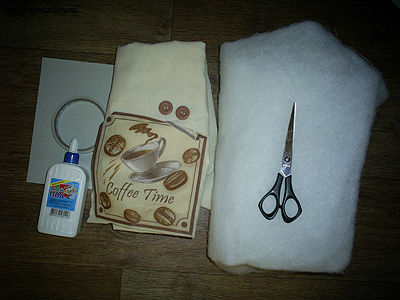 Для того чтобы сделать открытку, нам понадобятся такие материалы, как трехслойная салфетка с рисунком, клей ПВА, двухсторонний скотч, ножницы, синтепон, картон, термопистолет, суровая бязь, зерна кофе, пуговицы, сизалевая веревка.