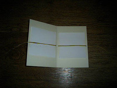 Складываем лист картона пополам и с помощью толстой иголки или шила проделываем по два отверстия по краям каждого листа. Продеваем тесьму так, как показано на фото и вдеваем в образовавшиеся кармашки листочки бумаги для записей.