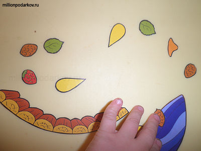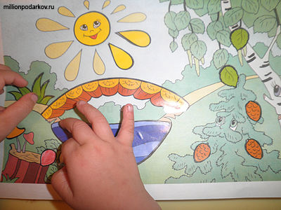 Заранее с помощью цветных карандашей подготавливаем рисунок так, чтобы ребенок только дополнял композицию с помощью наклеивания небольших элементов. В данном случае мы вырезали из цветной бумаги лучики, листики, шишки, ягодку и солнышко. Это разовьет внимание и мышление.