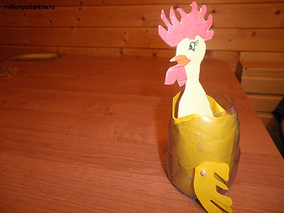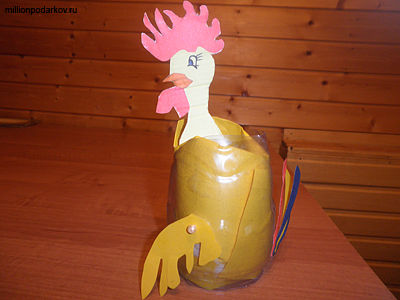 Иглой прокалываем бутылку в двух местах, к которым будем крепить крылышки. Прокалываем шею петуха и закрепляем с помощью бусинок. Желтую цветную бумагу помещаем внутрь бутылки.