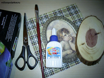 Для того чтобы сделать картинку в технике декупаж, мы использовали такие материалы, как трехслойная салфетка с рисунком, срез дерева, клей ПВА, ножницы, кисточку и акриловые краски.