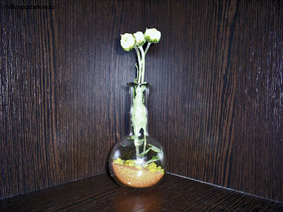 Итак, давайте соберем все необходимые материалы для изготовления нашей поделки. Нам понадобится цветной декоративный песок, который можно купить как в строительном магазине, так и в отделе художественных материалов. Кроме этого подготовьте стеклянную колбочку, декоративные камешки и цветы. Цветы могут быть как живыми, так и засушенными или искусственными.