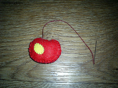 Пришиваем к одной детали яблочка желтое пятнышко. Теперь сшиваем две детали яблочка по лицевой стороне. Для этого используется петельный шов по краю изделия, во время которого нитка в виде петли набрасывается на иголку. Наполняем поделку кусочком синтепона и дошиваем ее.