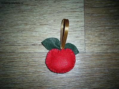 Пришиваем в середину яблочка петельку из атласной ленточки и пришиваем листочки, сшив их посередине.
