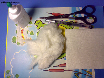 Приготовьте то, что потребуется. Это клей ПВА или силикатный, бумажные салфетки, ножницы, цветная бумага, лист белой бумаги, вата.