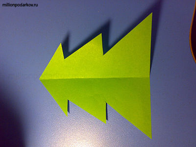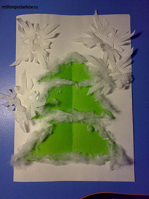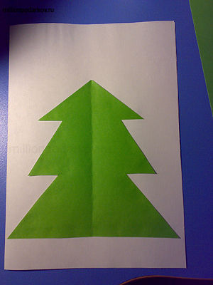 Берем лист А4, складываем его пополам, а затем приклеиваем к нему нашу зелёную ёлочку.