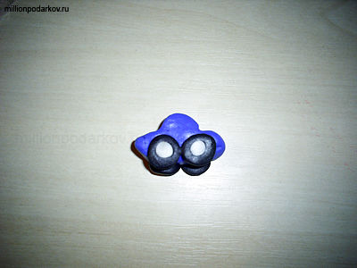 Из черной и белой пластики соорудим колесики. Для этого из черной пластики сделаем четыре шарика, сплющим их. Затем то же самое сделаем и с белой пластикой. Приклеим их к колесам.