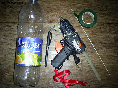 Для того чтобы сделать цветок, мы использовали пластиковую бутылку, клеящий термопистолет, бамбуковый шампура, черный маркер, атласную ленточку, флористическую ленту и цветной картон.
