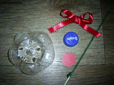 Отрезаем от бутылки дно. Откручиваем пробку. Атласную ленту завязываем бантиком. Бамбуковый шампур обматываем зеленой флористической лентой. Из картона вырезаем кружок по размеру пробки.