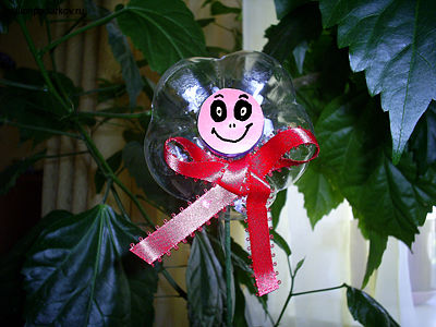 Приклеиваем к цветку стебелек и бантик, черным маркером нарисуем мордочку. Вот такая поделка для дачи из пластиковых бутылок у нас получилась в итоге.